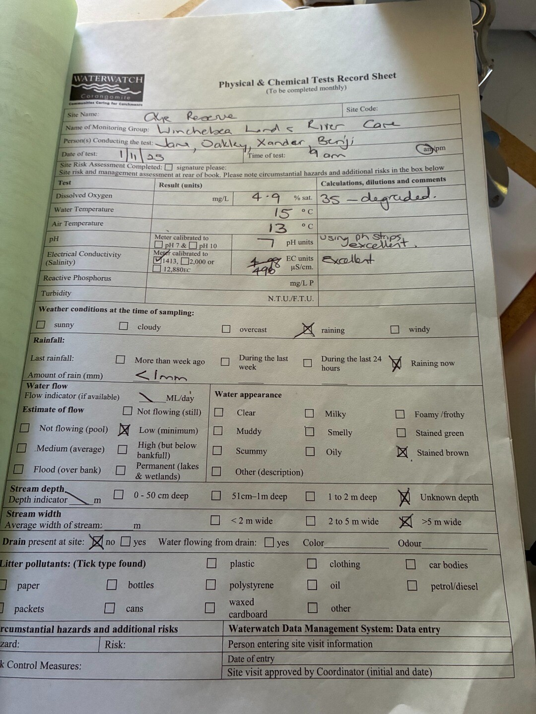 | recent high water levels - evidence of cutting into the bank on the left side - upstream of the monitoring site - reeds instream vegetation - mosquitos present | |||||